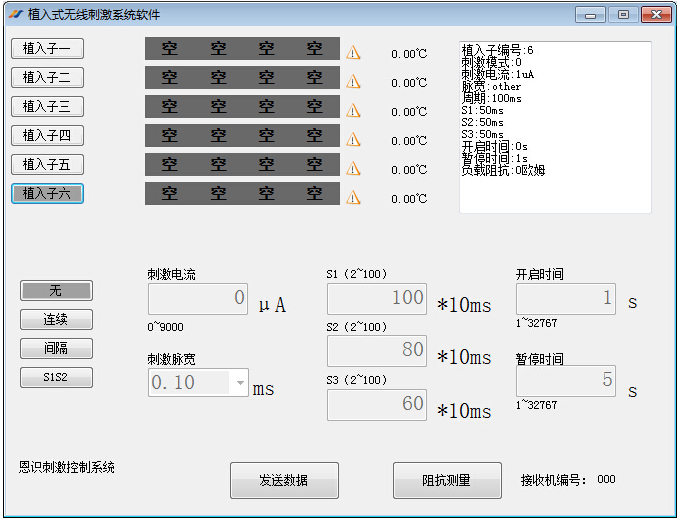 实验动物植入遥测系统可用于长期采集与监测意识清醒、非束缚、自由活动的实验动物的多种不同生理信号(如各种生物电、血压及温度信号)。同时该系统还实现了程序电刺激功能:将刺激电极植入到动物体内,刺激控制为程序控制。刺激电极的结构形状和刺激控制程序可根据实验需求进行选择和设定。刺激软件可根据实际刺激方案需求实现开启、关闭、待机、程序调控等功能,并可以与各生理信号的采集记录系统同步进行。该遥测系统中的接收机无线接收信号,每个接收机可同时接收6只实验动物的生理信号并同时可以完成给动物设定的电刺激。该系统工作时,动物因不受麻醉、束缚、体外导管或导线的限制,使研究者可以获得最为准确、真实的数据。该系统可兼容第三方主机接口及分析软件,对原始记录数据进行任意分析、统计、显示处理。本系统还可选配自主研发的远程控制软件,客户可通过互联网异地访问读取动物实验进行中的数据,实现远程多通道记录数据显示和远程监测刺激。