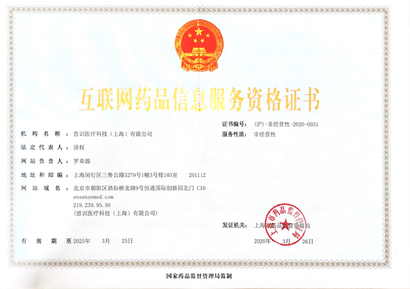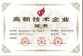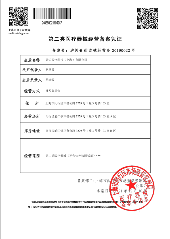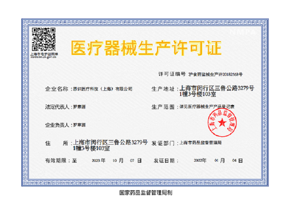 公司通过欧盟医疗器械法规(REGULATION (EU) 2017/745,简称“MDR”、ISO13485医疗器械行业质量管理体系,获批医疗器械CE认证及CFDA二类医疗器械的生产许可证(许可证编号:沪食药监械生产许20182568号)和中华人民共和国医疗器械注册证(注册证编号:沪械注准:20182070305),二类医疗器械经营备案凭证(备案号:沪闵食药监械经营备20190022号)以及互联网药品信息服务资格证书(证书编号:沪-非经营性-2020-0031)。